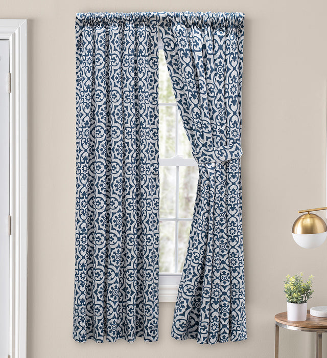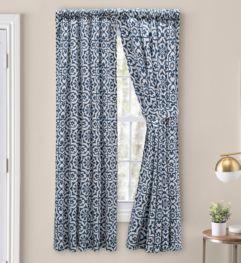 Athens collections feature a contemporary tile design print on a cotton fabric. Tailored Curtain Pair have a 3" pocket & no header. For proper fullness, use approx two times your window width in fabric. For wider windows use multiple valances and tiers. Matching Valances and Tiers also available. 100% Cotton, Machine Washable. Made in the USA. No tie back available for the curtain panels.