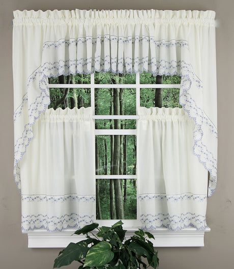 Beverly features a small scale embroidered flowers a solid color neutral background. Valance has a 1.5" rod pocket and a 1.5" header. For proper fullness, use approx two times your window width in fabric. For wider windows use multiple valances. Matching tiers and Swags Available. 100% Polyester, Machine Washable. Photo Shows: One valance