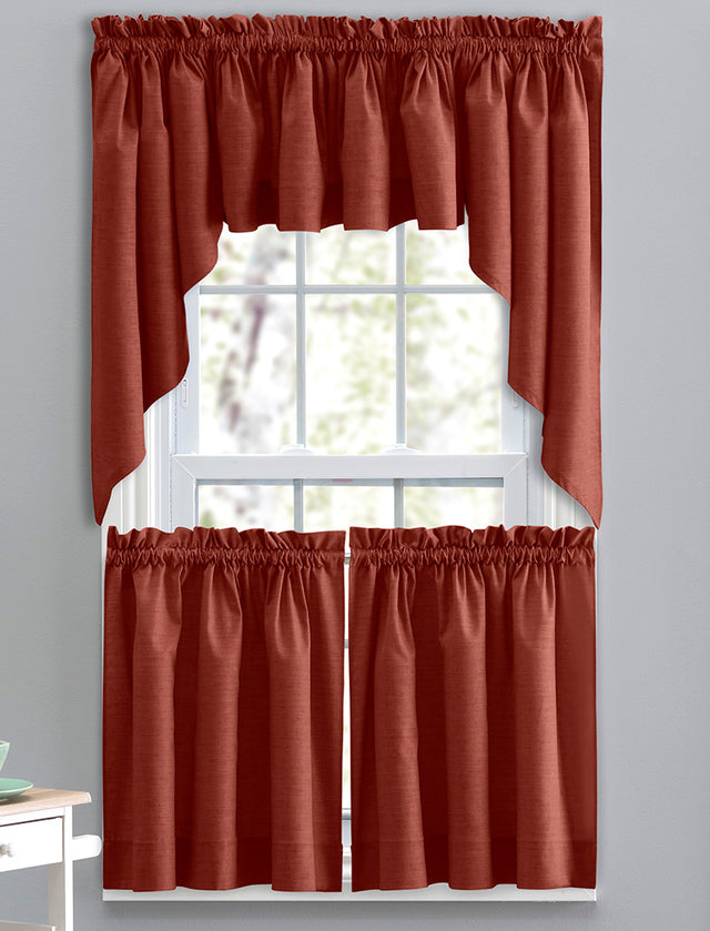 Lisa Solid tier pair features a textured solid print on a cotton duck cloth. Lisa solid have a 1 1/2" rod pocket & 1 1/2" header. For proper fullness, use approx two times your window width in fabric. For wider windows use multiple valances. 50% Polyester 50% Cotton Duck Cloth, Machine Washable. Matching Valances, Swags and Curtains sold separately. Made in the USA