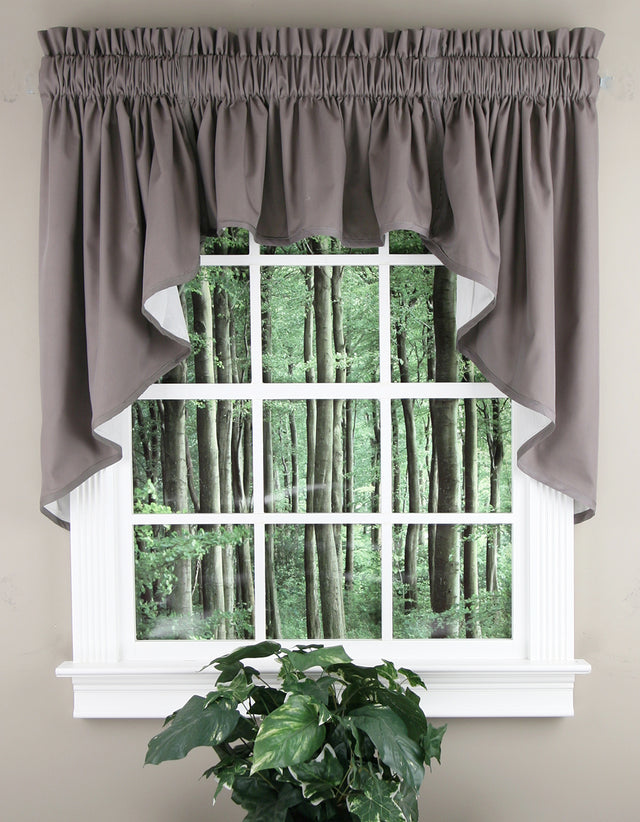 Stacey collection feature a poly-cotton blend material, valance and swag has a 3" pocket, 2" header. Fully lined. 70% Polyester/ 30% Cotton, Machine Washable. Set Displayed on a 40"W window. For proper fullness, use approx two times your window width in fabric. For wider windows use multiple valances.