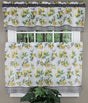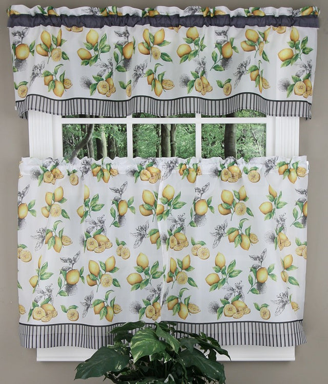 Lemon Drop Complete Kitchen Set features a large scale lemon and leaf pattern on a solid fabric accented with a stripe across the bottom border. Rod pocket is 1 1/2" with a 1" header. 100% polyester & machine washable. Fits windows up to 40" wide.