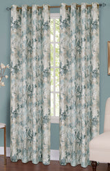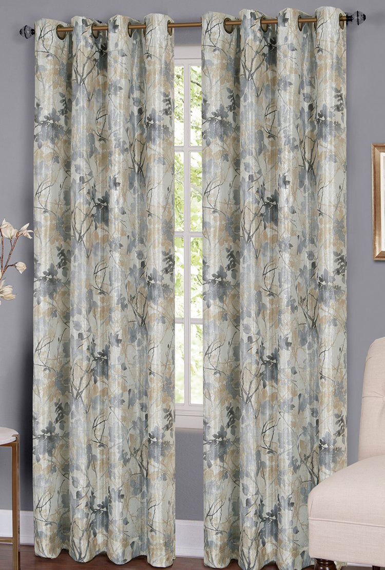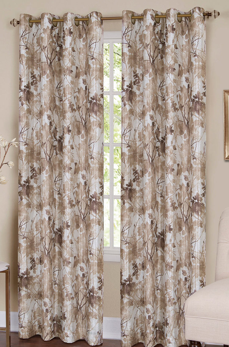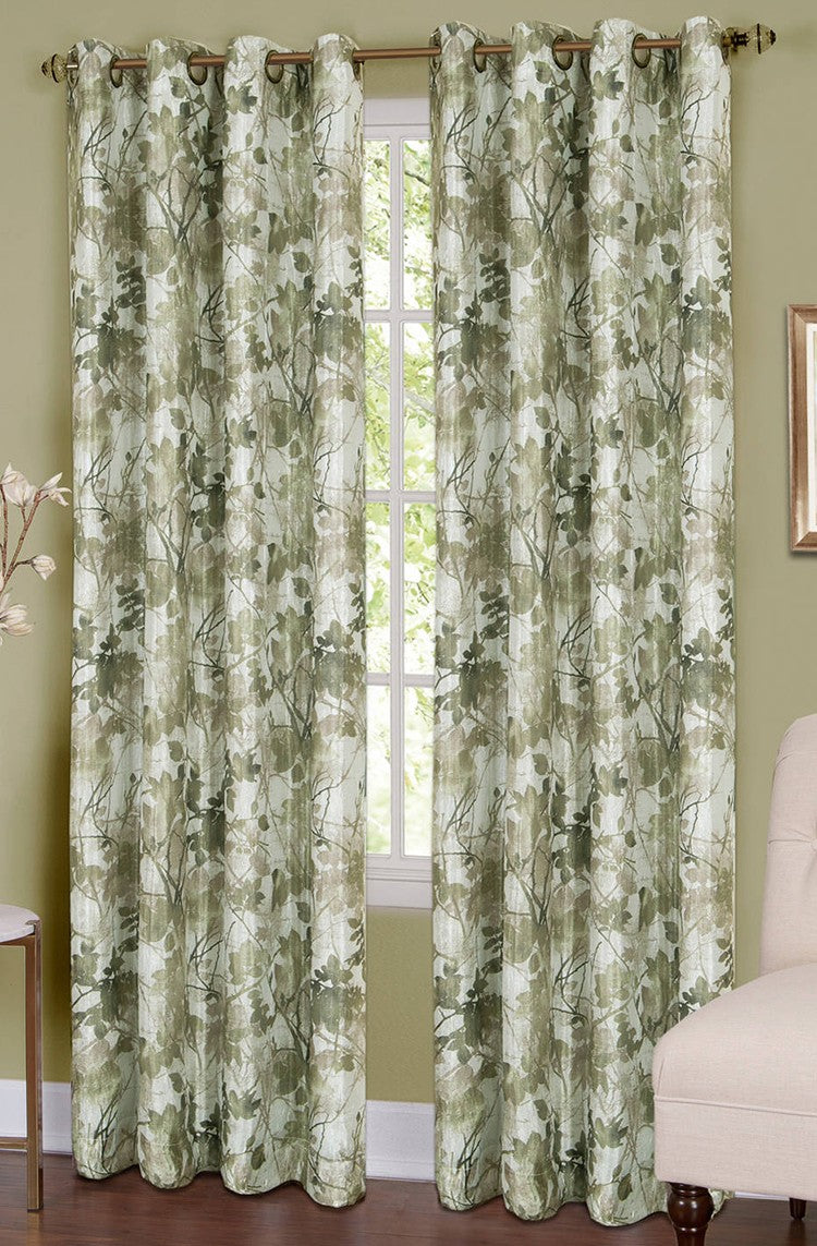 Tranquil Grommet Curtain Panel has a printed leaf and stem pattern and is a fully lined blackout curtain. Tranquil has a decorative 1 1/2" grommet. For proper fullness, panels should measure approx. 2 times the width of your window. For wider windows use multiple panels. 100% polyester & machine washable. Sold Individually