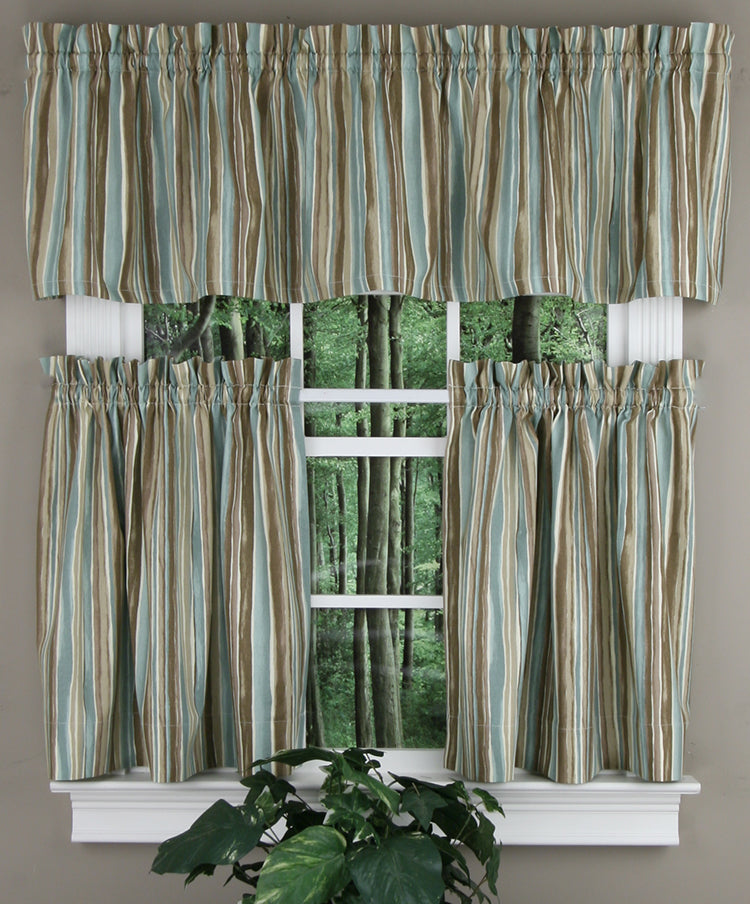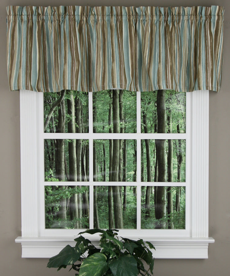 Stacey "M" Valance features a medium scale multi color stripe pattern. The Stacey "M" valance has a 3" rod pocket and 3" header. For proper fullness, use approx two times your window width in fabric, use multiple valances for wider windows. Matching tailored valance, swag sets & tiers Available. 100% Cotton, machine washable. Made in the USA!