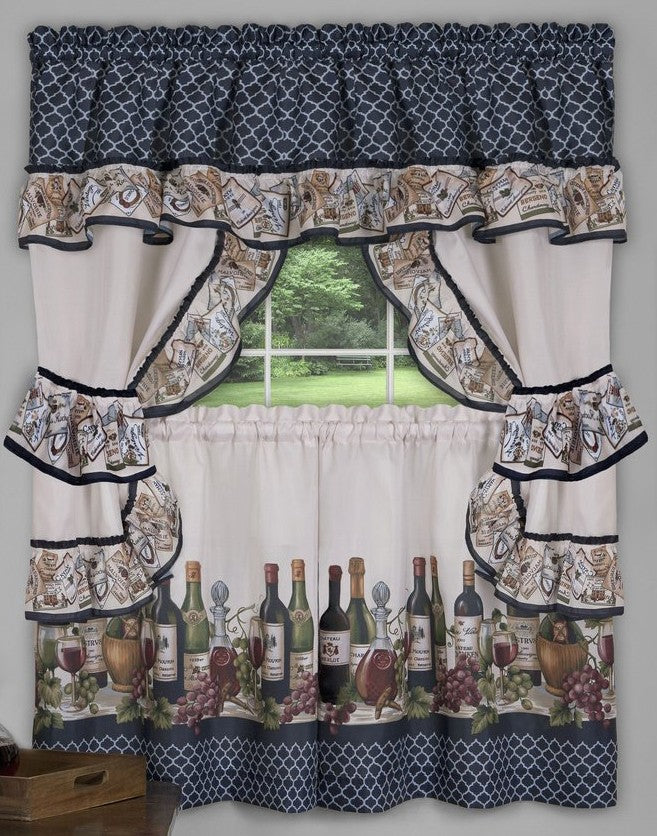 Chateau printed cottage set features a sophisticated array of grapes, wine bottles. glasses & carafes bordered with a navy trellis pattern highlighted with ruffled ties. Rod pocket is 1 1/2" with a 1" header. 100% polyester & machine washable. Fits windows up to 40" wide.