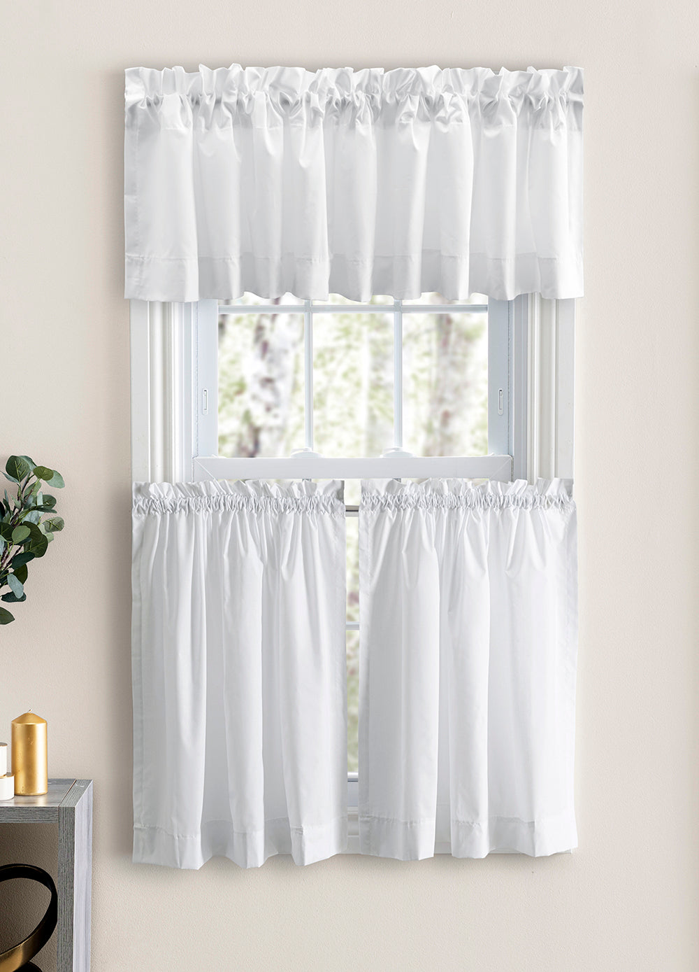 Classic Curtain collection features a soft poly/cotton broadcloth. Tailored Valances have a 3" pocket & 2" header. For proper fullness, use approx two times your window width in fabric. For wider windows use multiple valances. poly/cotton blend, Machine Washable. Matching Tiers Swags and Panels also available. Made in the U.S.A
