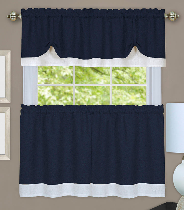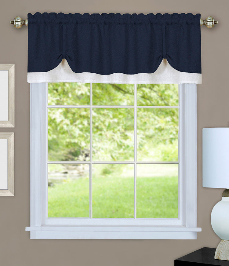Darcy Tier & Valance set features a solid color textured double layer pick-up valance and tiers. Rod pocket is 1 1/2" with a 1" header. Fits windows up to 40"W. Matching Pick-up valances also available. 100% polyester & machine washable.