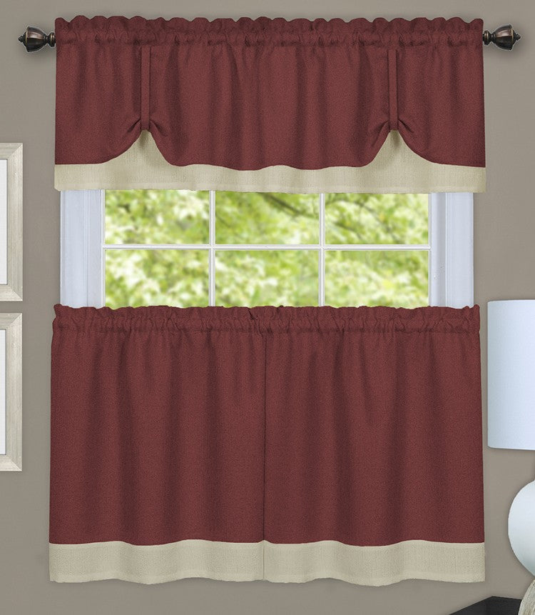 Darcy Valance & Tier Kitchen Curtain Set - Marsala/Tan / 58"W X 14"L Valance & 58"W X 24"L Tier Pair is backordered and will ship as soon as it is back in stock.