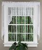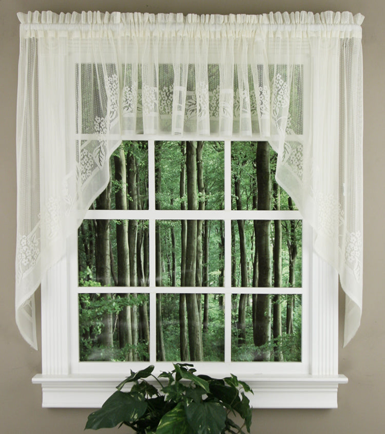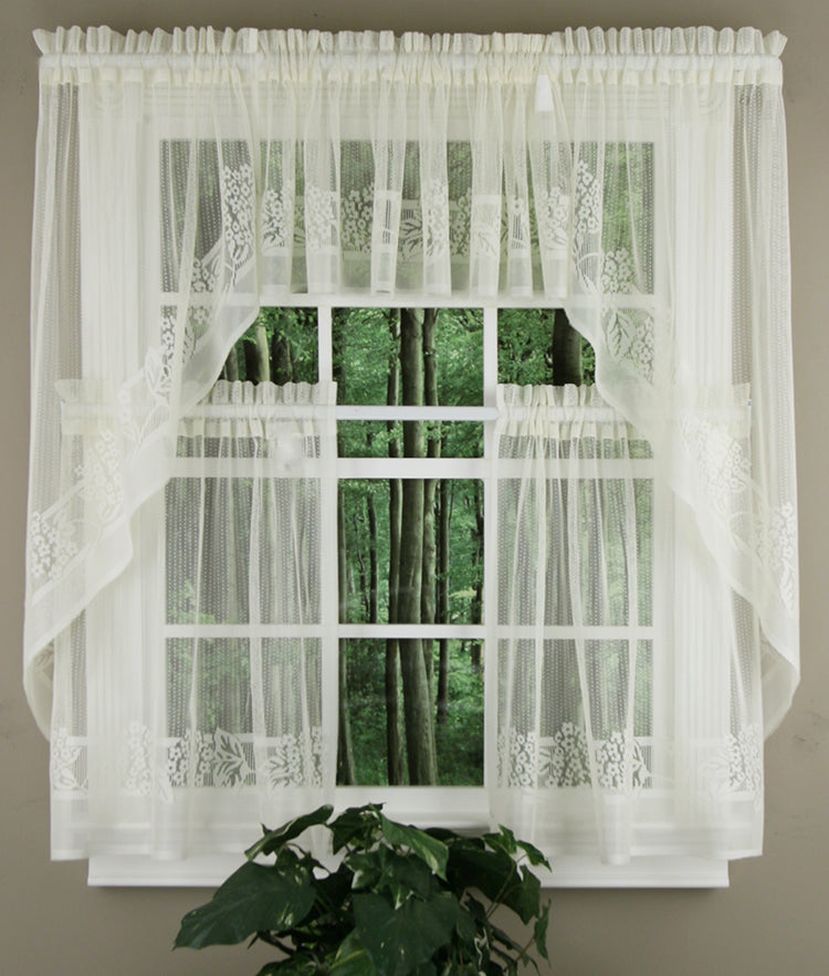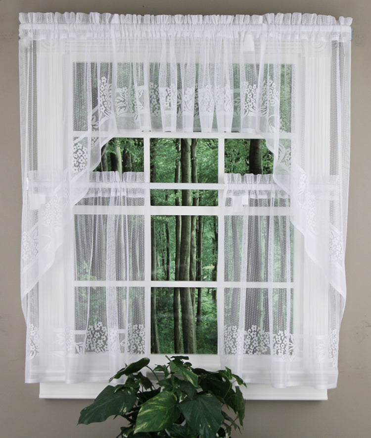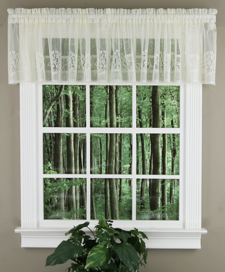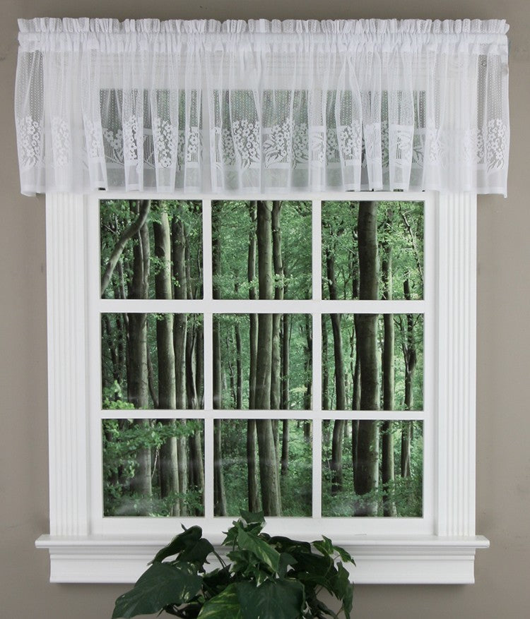 Hydrangea is a light weight lace that combines traditional fine gauge point d'espirt lace with a border pattern of hydrangea blossoms. Hydrangea Lace has a 1 1/2" rod pocket and 1 1/2" rod pocket. For proper fullness, use approx two times your window width in fabric, use multiple valances for wider windows. Matching valance and tiers available. 100% polyester, machine washable.