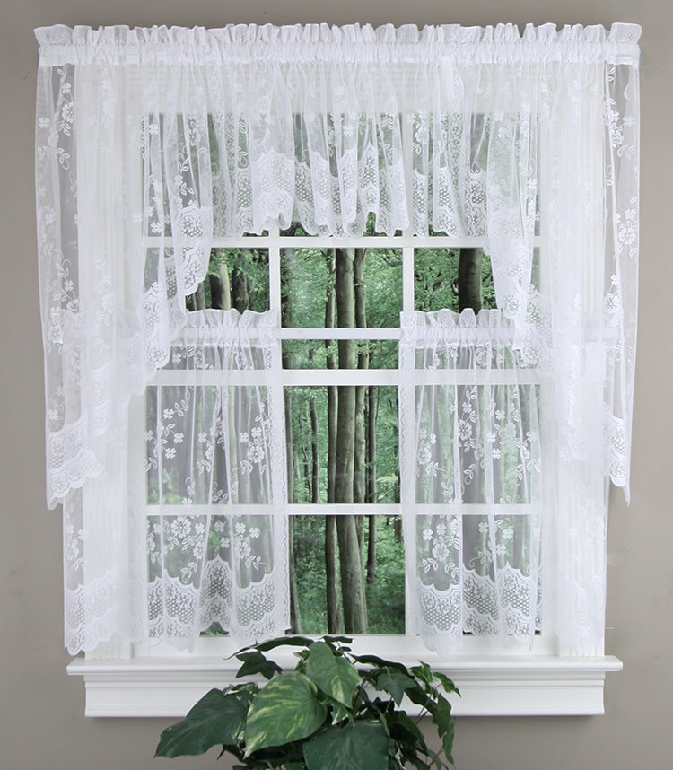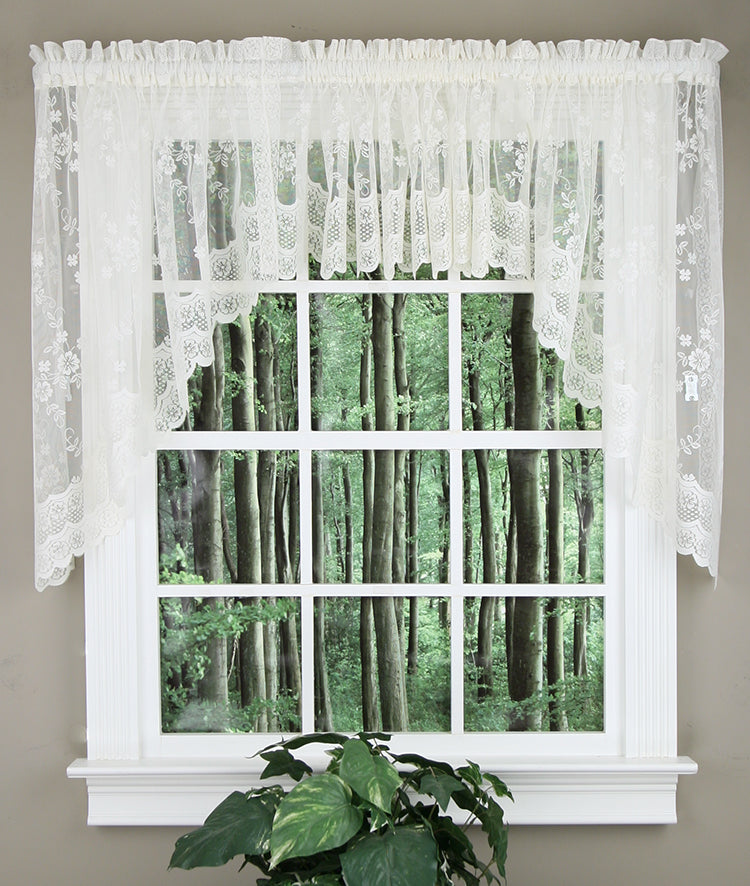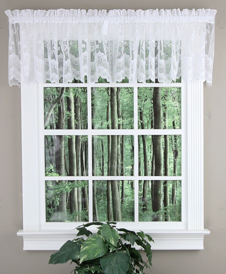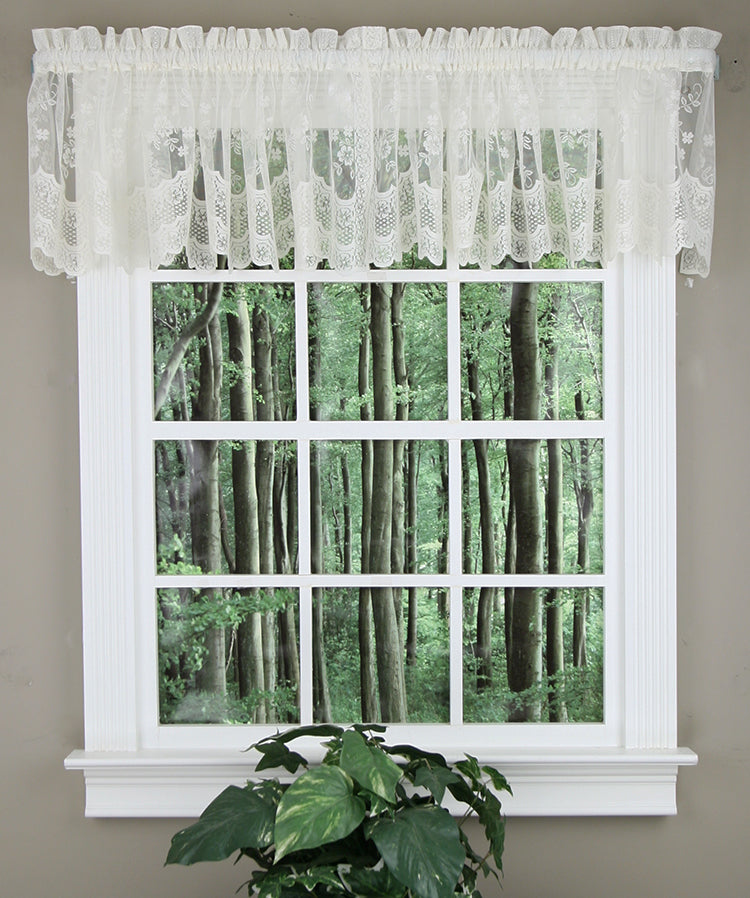 Mona Lisa features a european lace with a floral leaf and stem pattern. Mona Lisa has a 2" rod pocket and 1" header. For proper fullness, use approx two times your window width in fabric, use multiple valances for wider windows. Matching tiers & swags Available. 100% polyester, machine washable.