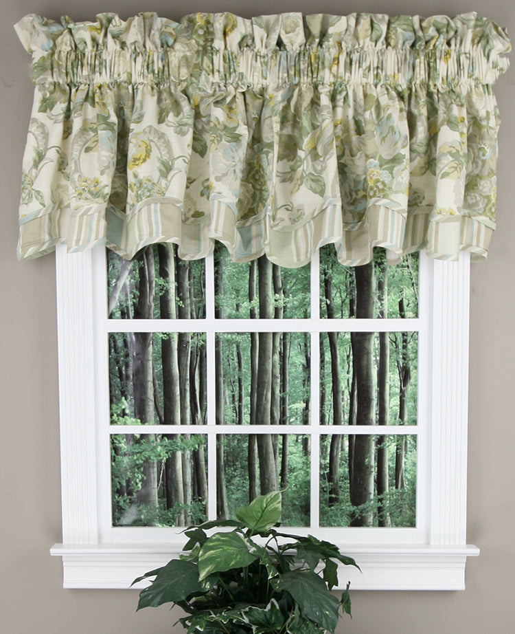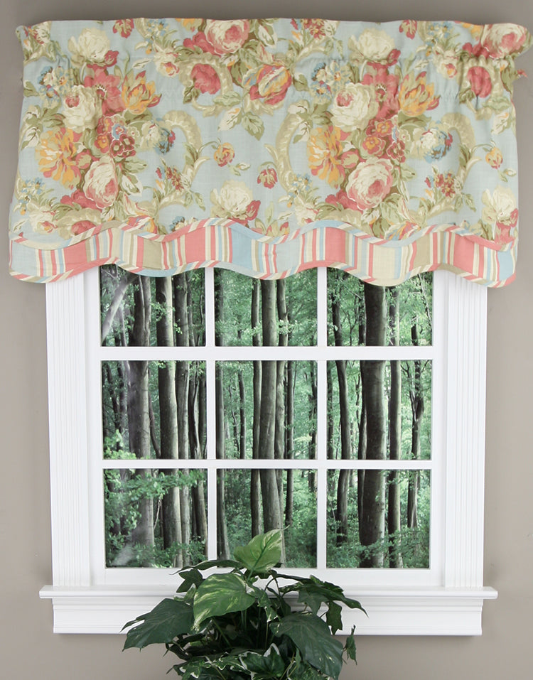 Spring Bling Lined Scalloped Valance by Waverly features a multi-color floral print accented with a stripe color coordinating trim. Valance has a 3" pocket & 2" header. For proper fullness, use approx two times your window width in fabric. For wider windows use multiple valances. 100% Cotton, Machine Washable